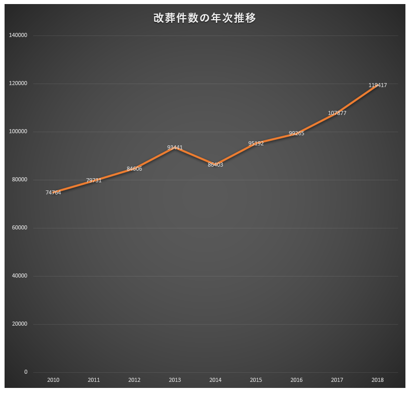 「墓じまい」とはこれまであった墓を撤去し、更地に戻すことを言います。その際は墓から遺骨を取り出して新しい供養先に入れるので、意味は「改葬」とほぼ同じです。厚生労働省の調査では改葬件数は年々増加傾向にあり、2018年度は11万件を超え、毎年過去最多となっています。
